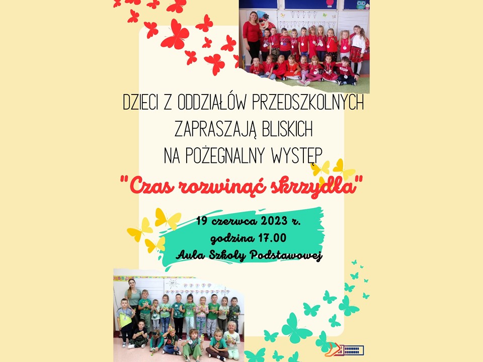 Uczniowie z oddziałów przedszkolnych zapraszają swoich bliskich na pożegnalny występ "Czas rozwinąć skrzydła", który odbędzie się 19 czerwca 2023 r. [...]