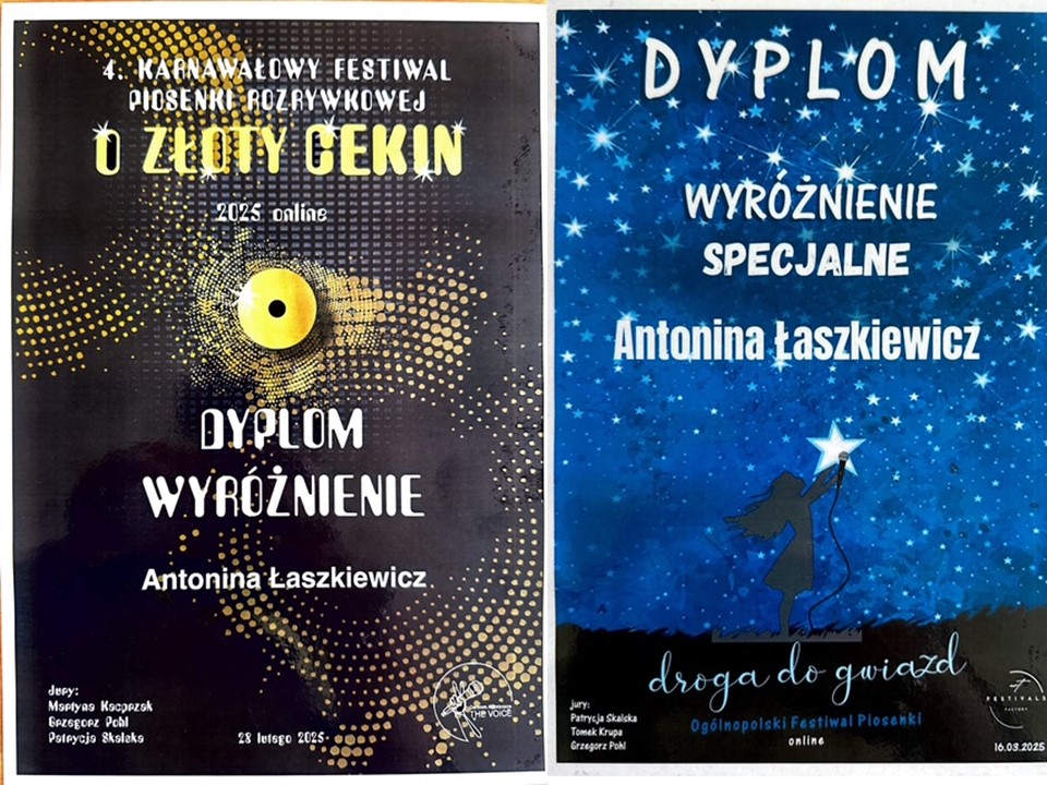 Serdeczne gratulacje dla Antoniny Łaszkiewicz za talent wokalny, który został doceniony na wielu konkursach online. Życzymy dalszych sukcesów.