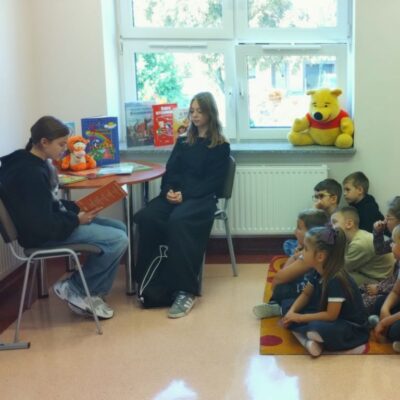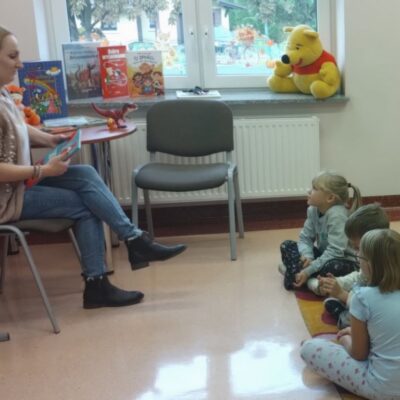 Dzień Głośnego Czytania obchodzony był w naszej szkole 29 września. W bibliotece zorganizowano spotkania czytelnicze dla oddziałów przedszkolnych z naszej szkoły. Dzieci razem ze swoimi wychowawcami wysłuchały czytanie bajki Braci Grimm w wykonaniu starszych uczennic z klasy 8c: Aleksandry Langner oraz Amelii Gzyl. Niezwykłą interpretację bajki pt. “Chcę być dinozaurem” zaprezentowały Pani Dyrektor Renata Pelczar oraz Pani Psycholog Agnieszka Zimna – Paluch. Podczas spotkania w bibliotece zasłuchane dzieci mogły przekonać się, że książki są jak skrzydła, które mogą unieść czytelnika wysoko, ku niezapomnianej przygodzie. Bibliotekarka zachęca do częstego otwierania drzwi biblioteki, które prowadzą do świata wyobraźni, przygody, mądrości i magii.