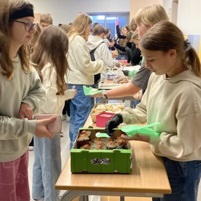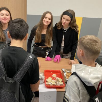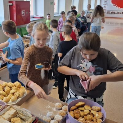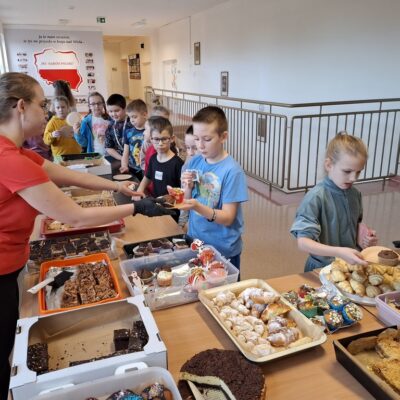 Pyszne ciasta, pachnące ciasteczka, ciepłe gofry z bitą śmietaną i wiele innych słodkości królowało na naszych szkolnych stołach w miniony piątek. A wszystko to w ramach ogólnopolskiej akcji charytatywnej Szlachetna Paczka. Jak co roku przed Świętami Bożego Narodzenia cała społeczność szkolna angażuje się w zbiórkę dla  wybranej Rodziny. Tym razem pomagamy niewidomemu Panu Danielowi. Pieniądze zebrane podczas sprzedaży ciast w kwocie 4.342,89 zł zostaną przeznaczone na zakup specjalistycznego telefonu i innych najbardziej potrzebnych rzeczy. Dziękujemy z całego serca wszystkim, którzy pomogli nam uzbierać taką kwotę – tym, którzy piekli słodkości i tym, którzy je kupowali. Przypominamy, że akcja trwa do 9 grudnia, jeśli ktoś jeszcze chciałby się dołączyć, to czekamy. Można wesprzeć wpłacając do puszek w klasach pieniądze, albo zakupić produkty trwałe i przynieść do szkoły. Lista potrzeb jest na stronie szkoły i na szkolnym facebook’u, a także na plakatach w obu budynkach.
