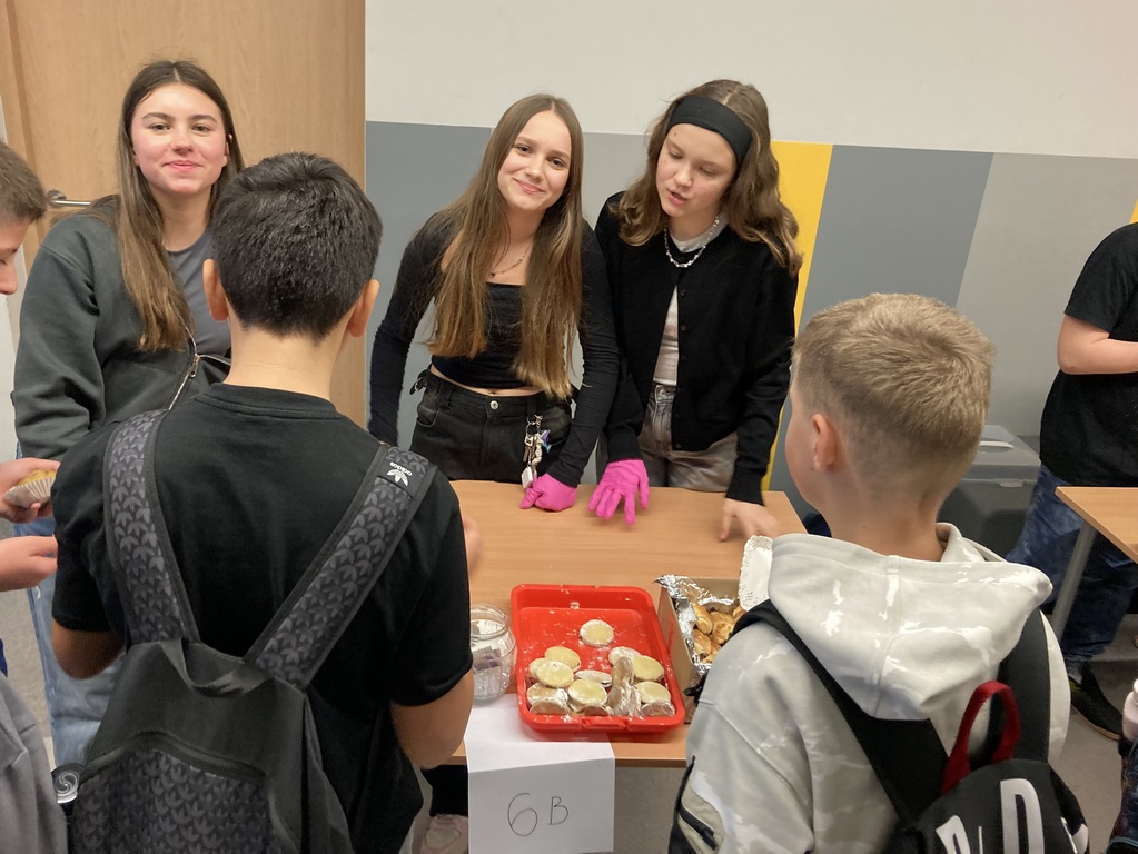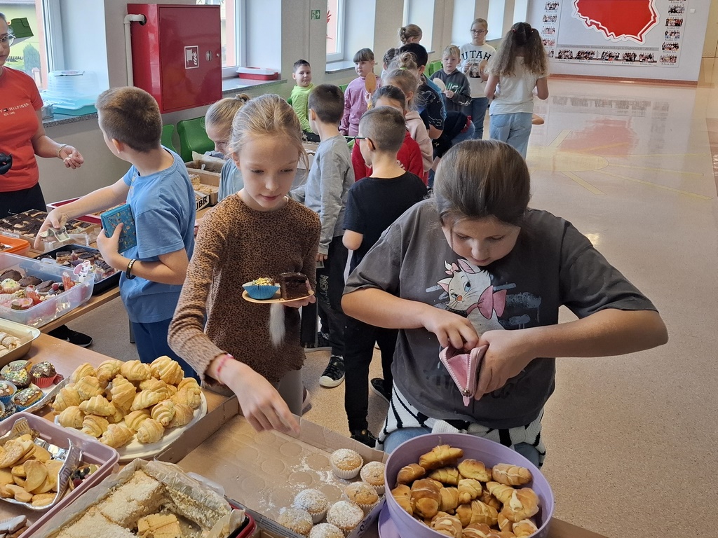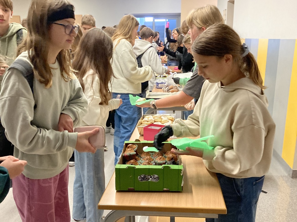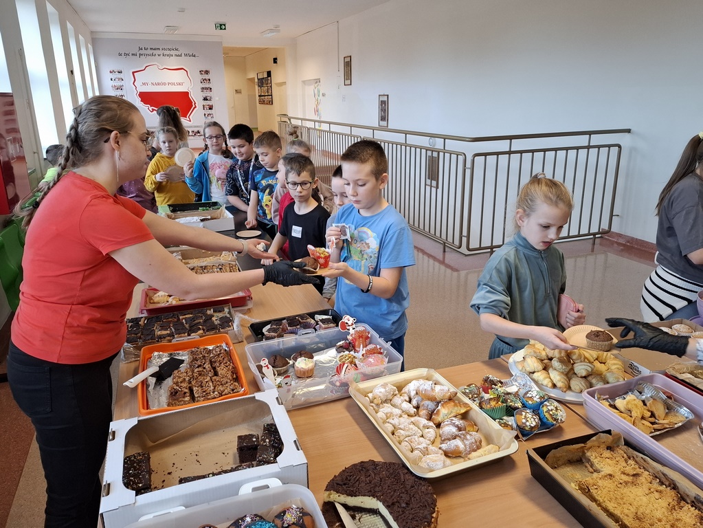 Pyszne ciasta, pachnące ciasteczka, ciepłe gofry z bitą śmietaną i wiele innych słodkości królowało na naszych szkolnych stołach w miniony piątek. A wszystko to w ramach ogólnopolskiej akcji charytatywnej Szlachetna Paczka. Jak co roku przed Świętami Bożego Narodzenia cała społeczność szkolna angażuje się w zbiórkę dla  wybranej Rodziny. Tym razem pomagamy niewidomemu Panu Danielowi. Pieniądze zebrane podczas sprzedaży ciast w kwocie 4.342,89 zł zostaną przeznaczone na zakup specjalistycznego telefonu i innych najbardziej potrzebnych rzeczy. Dziękujemy z całego serca wszystkim, którzy pomogli nam uzbierać taką kwotę – tym, którzy piekli słodkości i tym, którzy je kupowali. Przypominamy, że akcja trwa do 9 grudnia, jeśli ktoś jeszcze chciałby się dołączyć, to czekamy. Można wesprzeć wpłacając do puszek w klasach pieniądze, albo zakupić produkty trwałe i przynieść do szkoły. Lista potrzeb jest na stronie szkoły i na szkolnym facebook’u, a także na plakatach w obu budynkach.