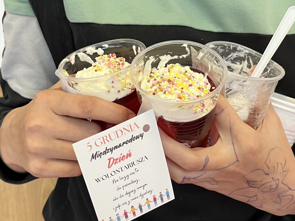 5 grudnia to ważna data w życiu każdego Wolontariusza – tego dnia obchodzimy Międzynarodowy Dzień Wolontariatu. Z tej okazji uczennice ze Szkolnego Koła Wolontariatu z klas 5 – 8 sprzedawały dzisiaj pyszne galaretki z bitą śmietaną i kolorowymi posypkami. Do kubeczków ze smakołykiem dołączone były bileciki z przesłaniem bliskim każdemu Wolontariuszowi – „Nie liczy się to, ile posiadamy, ale ile dajemy innym i jak się z nimi dzielimy”. Galaretki rozeszły się w ciągu jednej przerwy, a z ich sprzedaży udało się uzbierać 372 zł. Pieniądze zostaną wykorzystane na cele charytatywne. Dziękujemy wszystkim, którzy zakupili i w jakikolwiek sposób wsparli naszą akcję. Koordynatorem była Katarzyna Sypniewska – opiekun Szkolnego Koła Wolontariatu klas starszych.