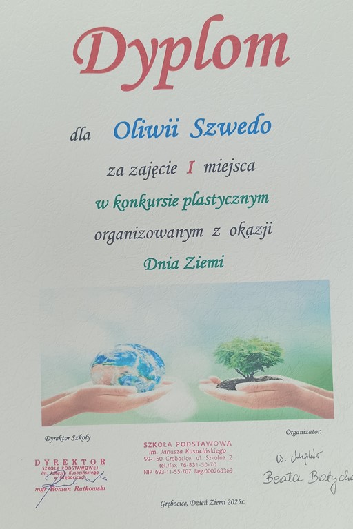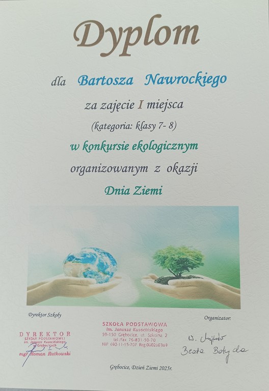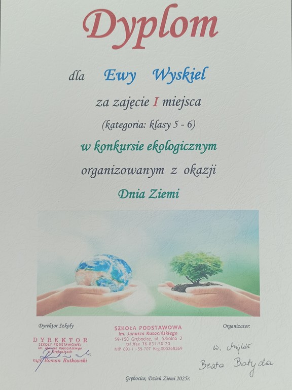 - Dyplom wręczony w konkursie z okazji Dnia Ziemi