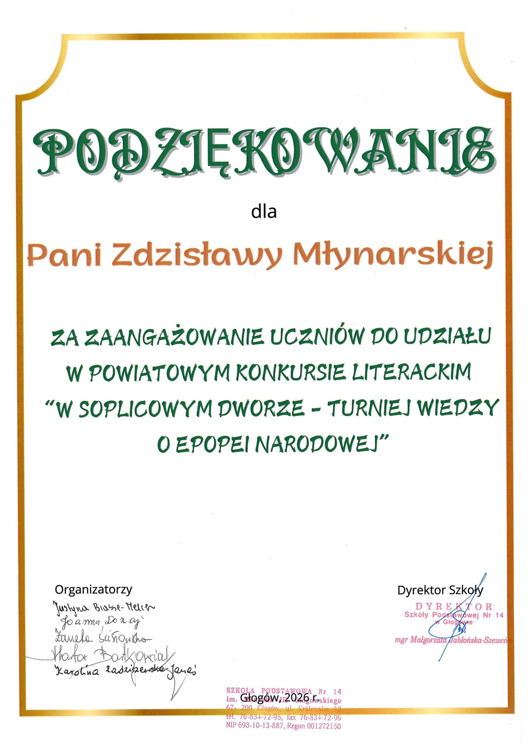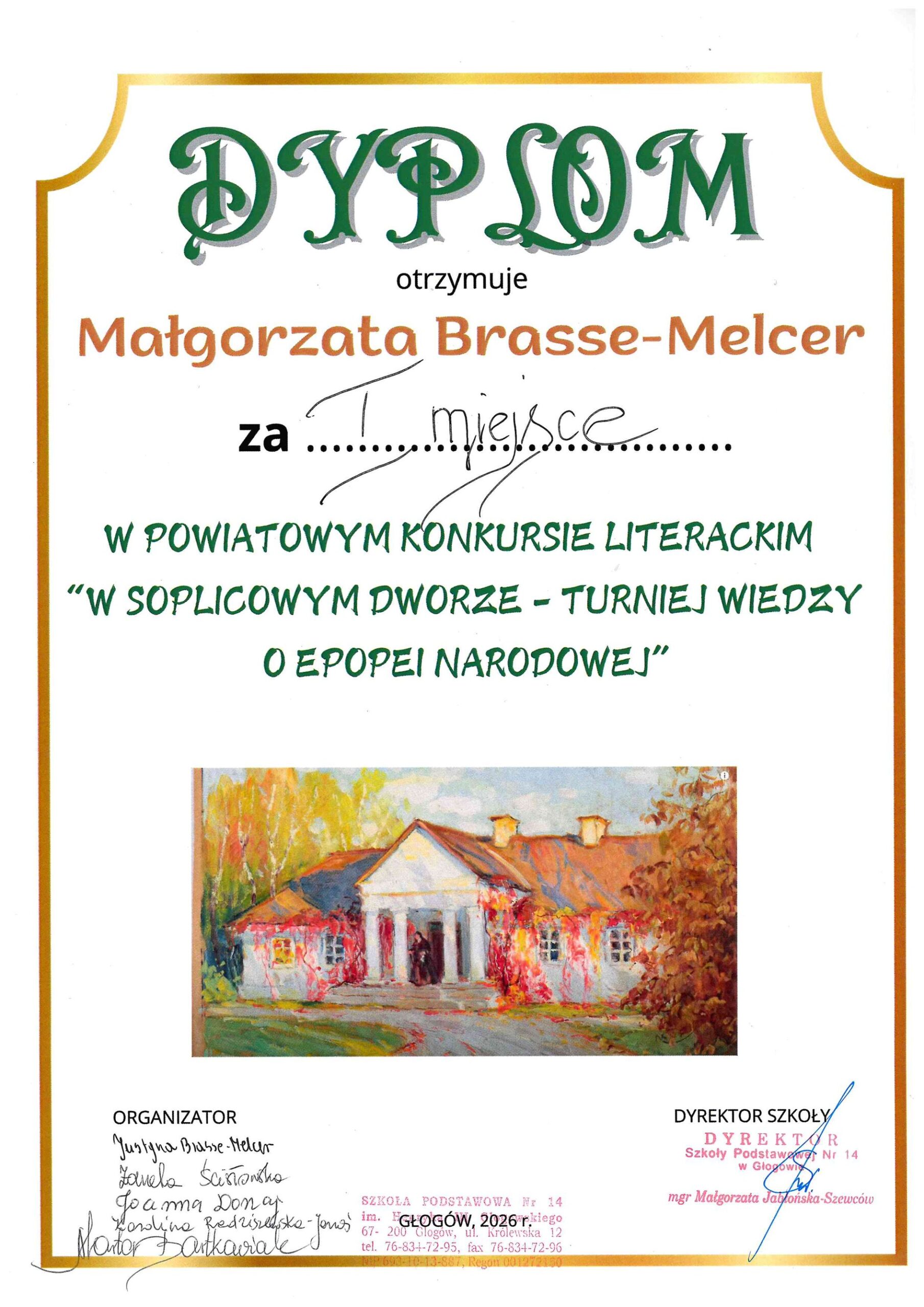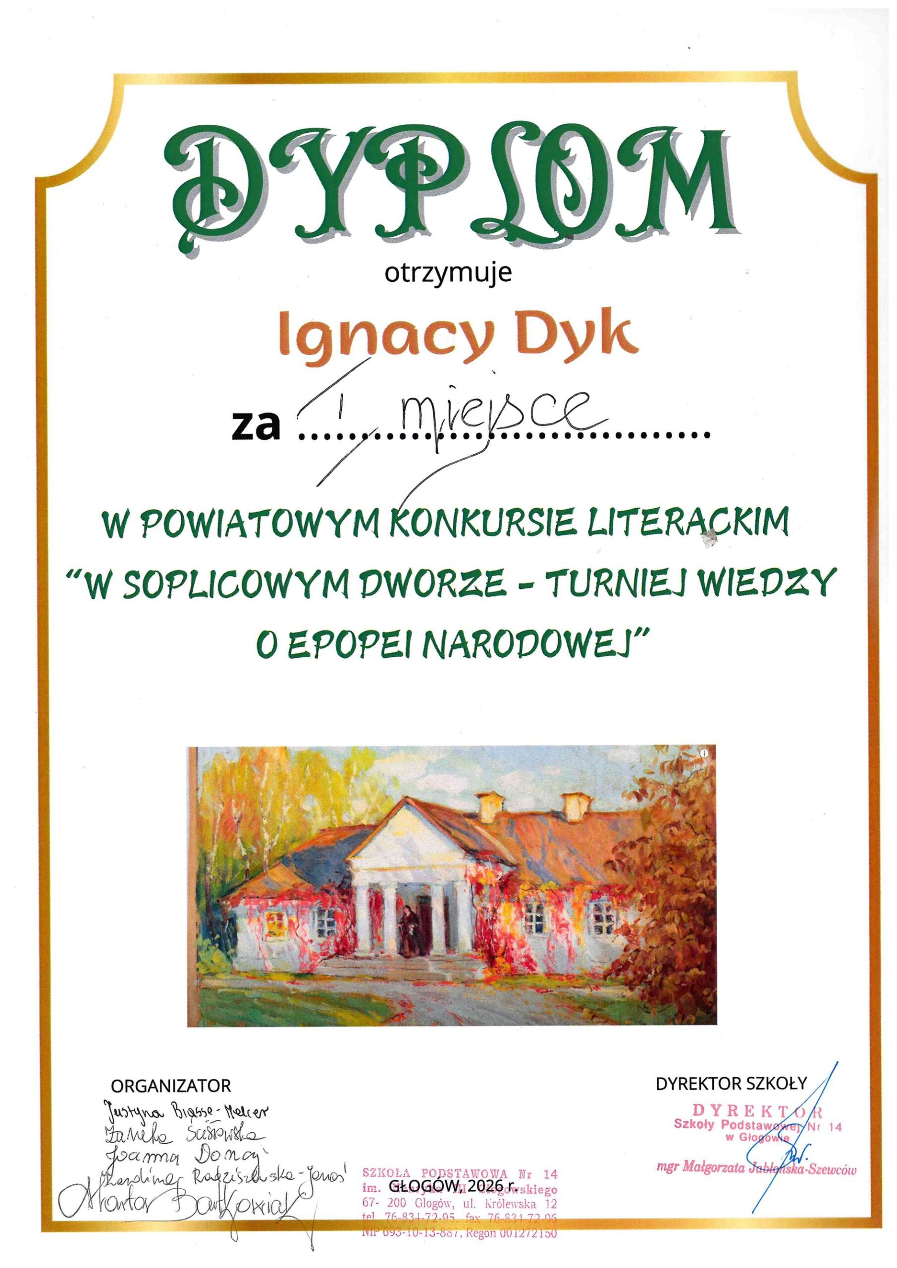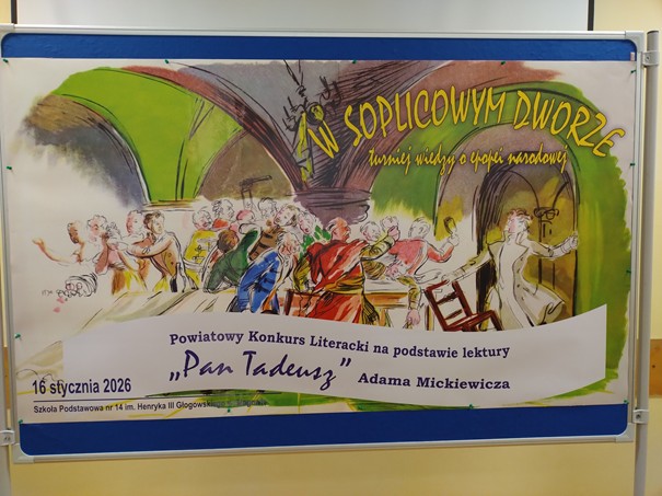 16 stycznia 2026r. w Szkole Podstawowej nr 14 w Głogowie odbył się Powiatowy Konkurs Literacki “W Soplicowym Dworze – turniej wiedzy o epopei narodowej”. Naszą szkołę reprezentowali uczniowie z klasy 8 b Małgorzata Brasse-Melcer i Ignacy Dyk, którzy zajęli I miejsce. Uczniów do konkursu przygotowała pani Zdzisława Młynarska.