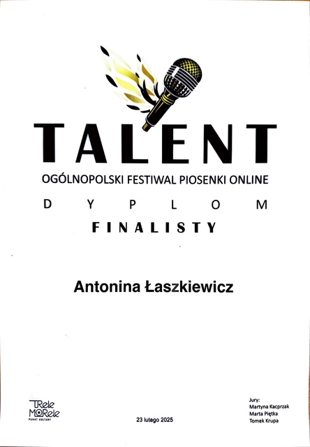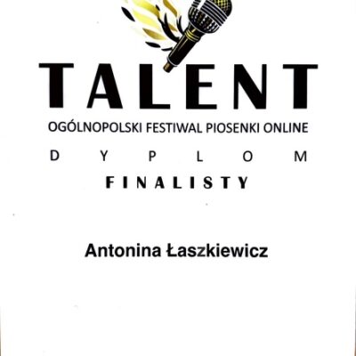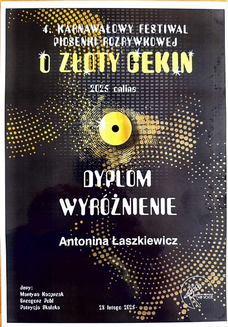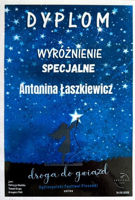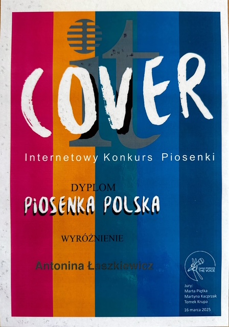 Serdeczne gratulacje dla Antoniny Łaszkiewicz za talent wokalny, który został doceniony na wielu konkursach online. Życzymy dalszych sukcesów.