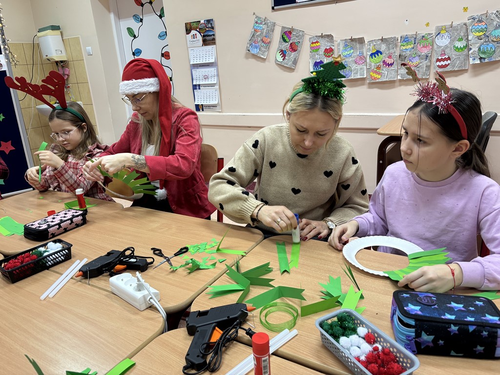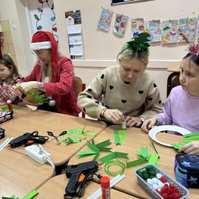 W klasie 2b również zapanowała świąteczna atmosfera podczas warsztatów rodzinnych. Dzieci wraz z rodzicami wykonały wianki z papieru. Zorganizowane zajęcia z pewnością pozwoliły celebrować okres przedświąteczny w atmosferze bliskości i radości. Dziękuję za wspólnie spędzony czas – wychowawczyni Małgorzata Kapica.
