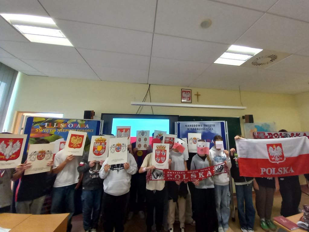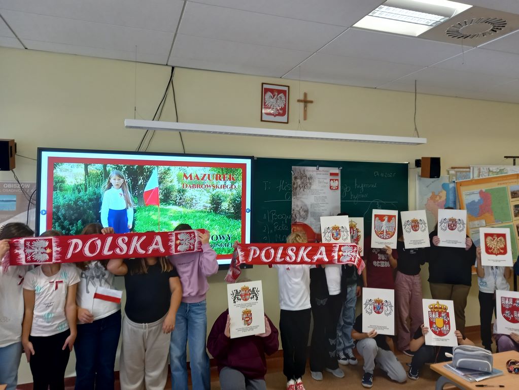 Z okazji obchodów Święta Niepodległości oraz w ramach edukacji patriotycznej i obywatelskiej – uczniowie klas 4- 8 przypomnieli historię polskiego hymnu narodowego. Na lekcjach historii każdy wykazał się znajomością “Mazurka Dąbrowskiego “. Byli również tacy, którzy nauczyli się sześciu zwrotek. W trakcie odśpiewania hymnu uczniowie mieli patriotyczne elementy ubioru i zdali na oceny celujące.