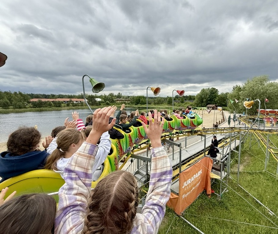 - Uczniowie podczas jazdy kolejką górską