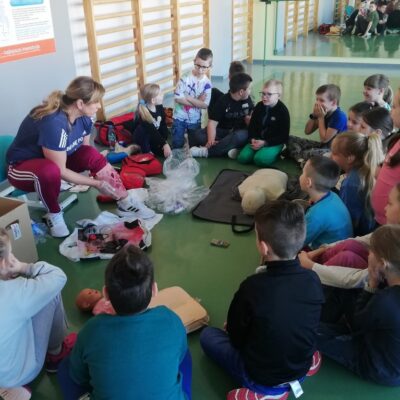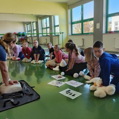 Pierwszklasiści wzięli udział w zajęciach z pierwszej pomocy. Dowiedzieli się, jak reagować w trudnych sytuacjach, poznali wszystkie etapy udzielania pomocy, a także uczyli się, jak radzić sobie z różnego rodzaju obrażeniami. Dzieci zapoznały się także z pracą urządzenia AED. Dziękujemy p. Ewie Małuckiej za tak cenną lekcję!