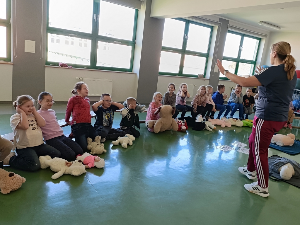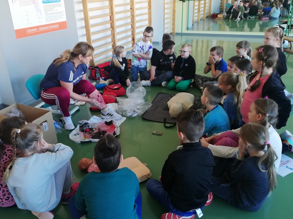 Pierwszklasiści wzięli udział w zajęciach z pierwszej pomocy. Dowiedzieli się, jak reagować w trudnych sytuacjach, poznali wszystkie etapy udzielania pomocy, a także uczyli się, jak radzić sobie z różnego rodzaju obrażeniami. Dzieci zapoznały się także z pracą urządzenia AED. Dziękujemy p. Ewie Małuckiej za tak cenną lekcję!